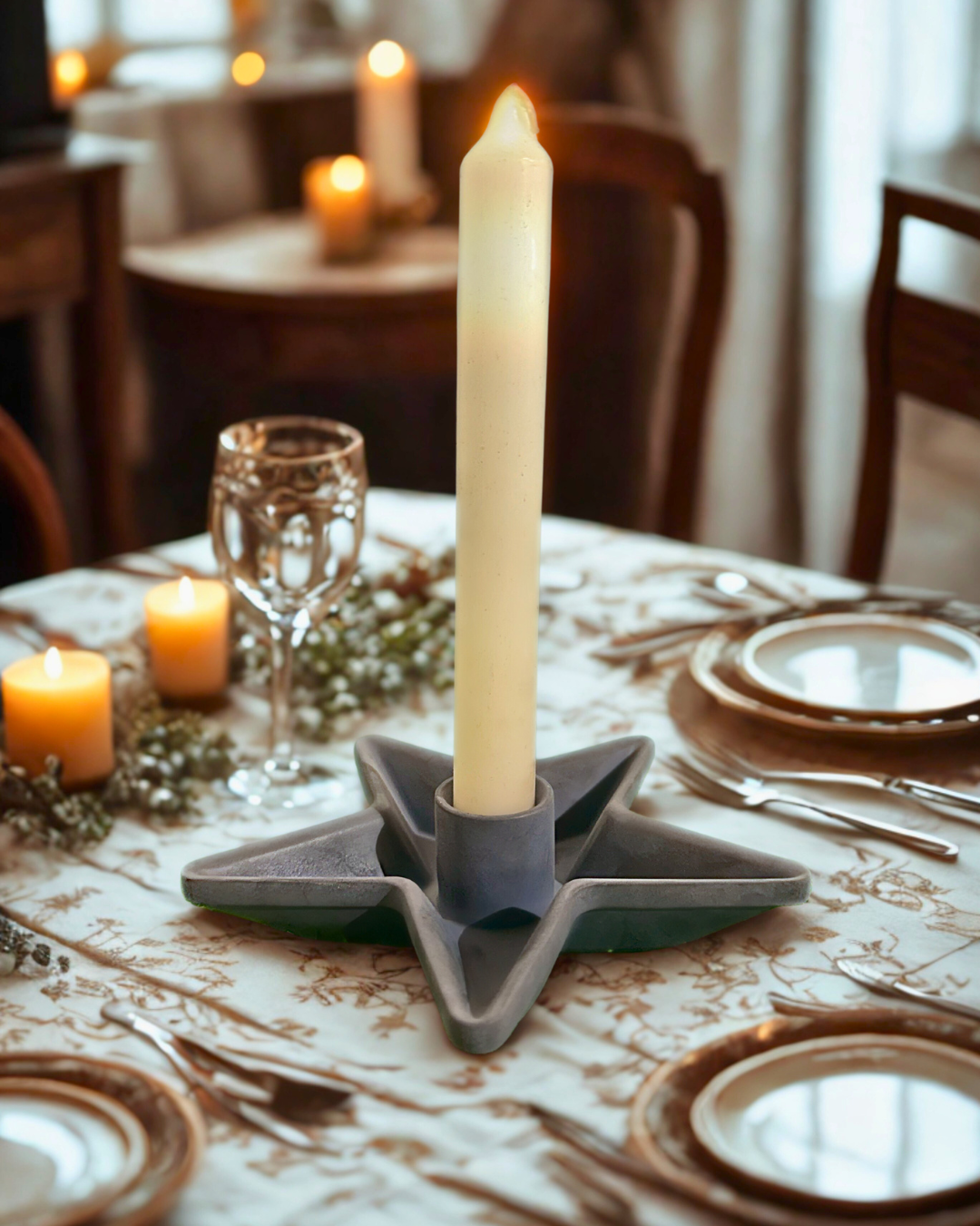 Der Kerzenhalter „Lichtblick“ bringt stilvolle Gemütlichkeit in dein Zuhause – mit einer einzigartigen, sternförmigen Form und einer eleganten beigefarbenen Stabkerze (inklusive!). Ob zur Adventszeit, für lange Sommerabende oder als charmantes Geschenk – dieses Set ist bereit für jeden Anlass, bei dem es auf Atmosphäre ankommt.